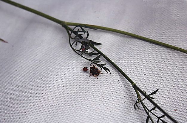 Während die Wespen in Ruhe gelassen werden sollten, durfte alles andere behutsam in Becherlupen verfrachtet werden. So landeten zunächst die fleißigen Hummeln und einige Wanzen und Käfer in den Behältern. Jedes Mal, wenn ein Exemplar bestimmt war, wurde der Name notiert das Tier anschließend wieder in die Freiheit entlassen. Die genaue Bestimmung der vielen Heuschrecken war hierbei nicht entscheidend, vielmehr ging es darum, die Vielfalt der Insekten zu zeigen. Auf diese Weise wurden noch einige Siebenpunktmarienkäfer, kleine Laufkäfer und die gemeine Wiesenwanze gezählt. Die allerkleinsten Exemplare wie Ameisen wurden mit Hilfe eines Insektensaugers gefangen.